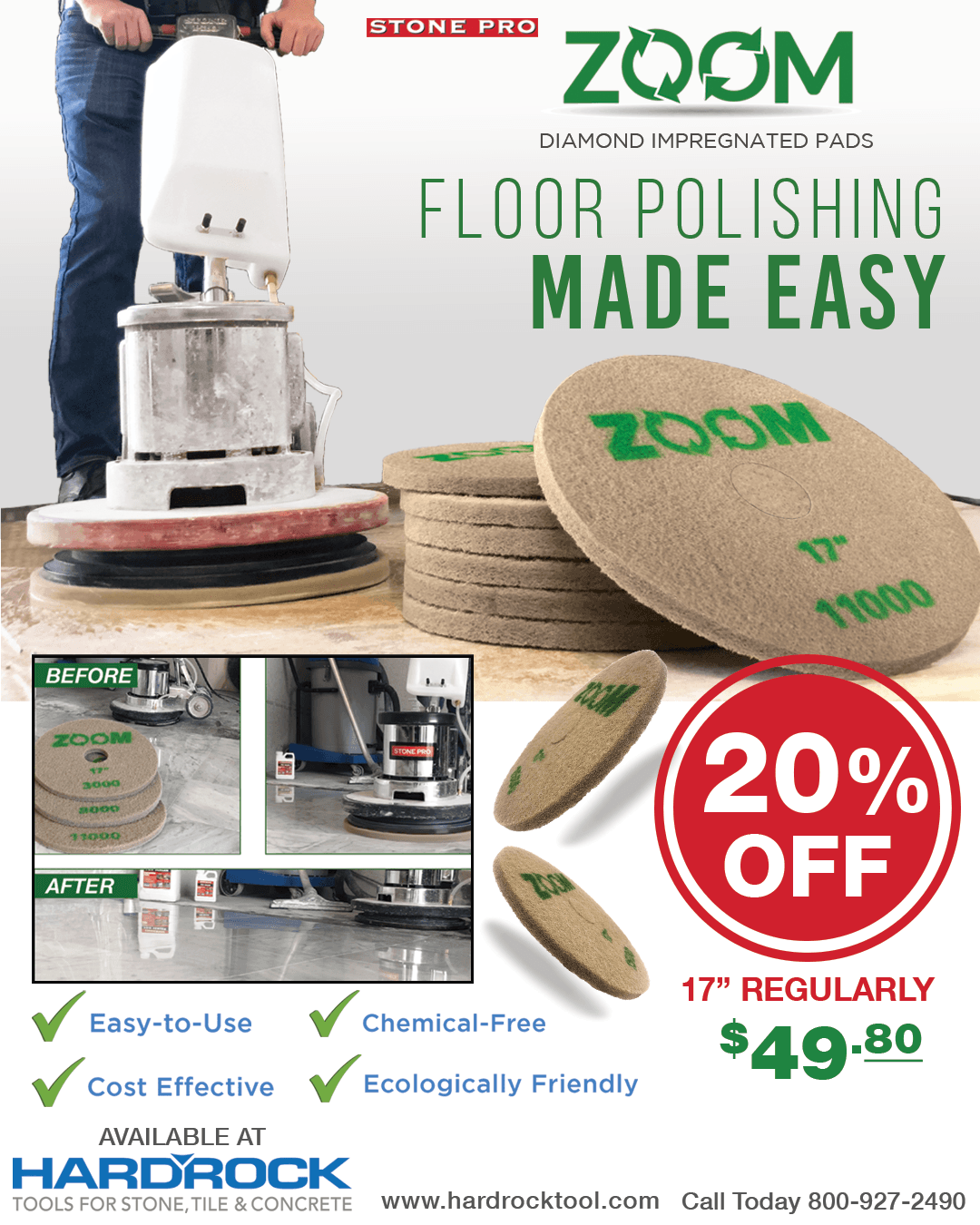 ZOOM pads, by definition, should be your go to polishing method. The FASTEST, cleanest and easiest process to SHARPLY INCREASE shine and clarity to a marble floor.