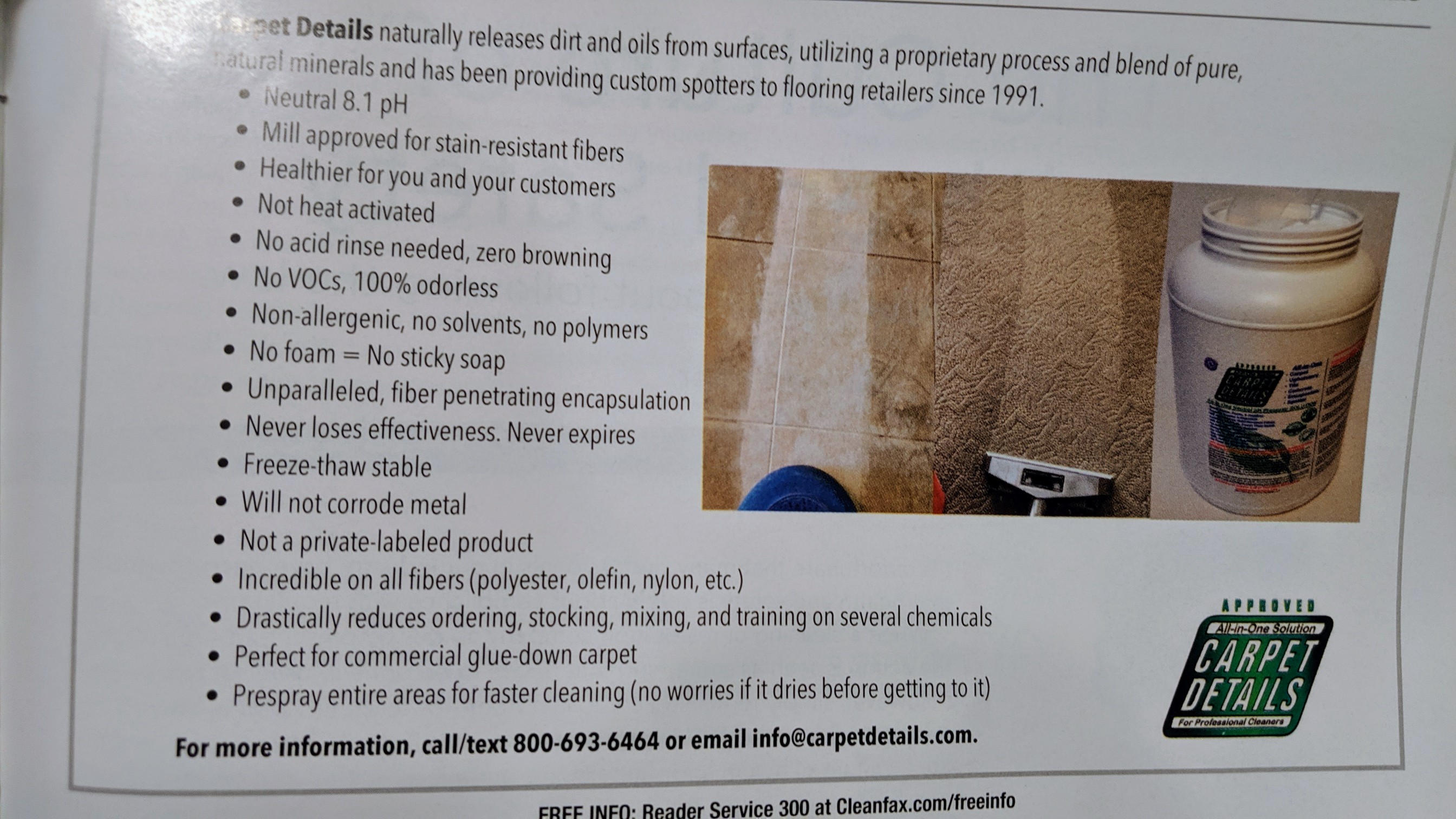 Yea lots of big words but it does work. Used it yesterday on two high end area carpets 1 was very dirty off white .I used the vibe on both carpets and they look great. Glad I tried the free samples. Iv'e talked to Jeff and they do encapsulation most of the time they are a carpet cleaning service. Carpet details has worked better than Procyon and I have both to use. The only thing is no fragrance but that can be good. They are in this months Cleanfax mag. jz