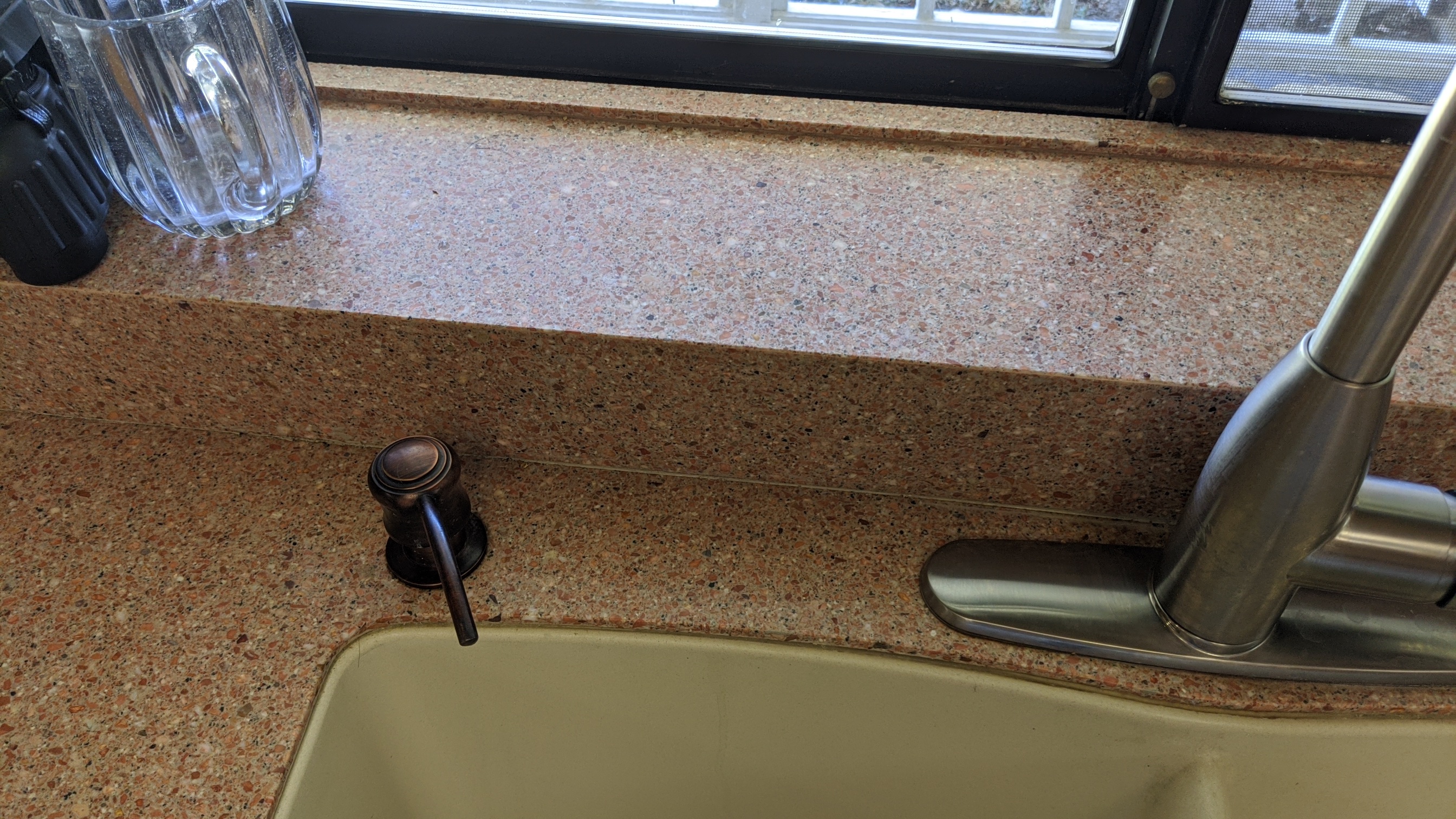 A Quartz likes synthetic just a quarter inch thick completely covering the old 1979 4x4 tiles...