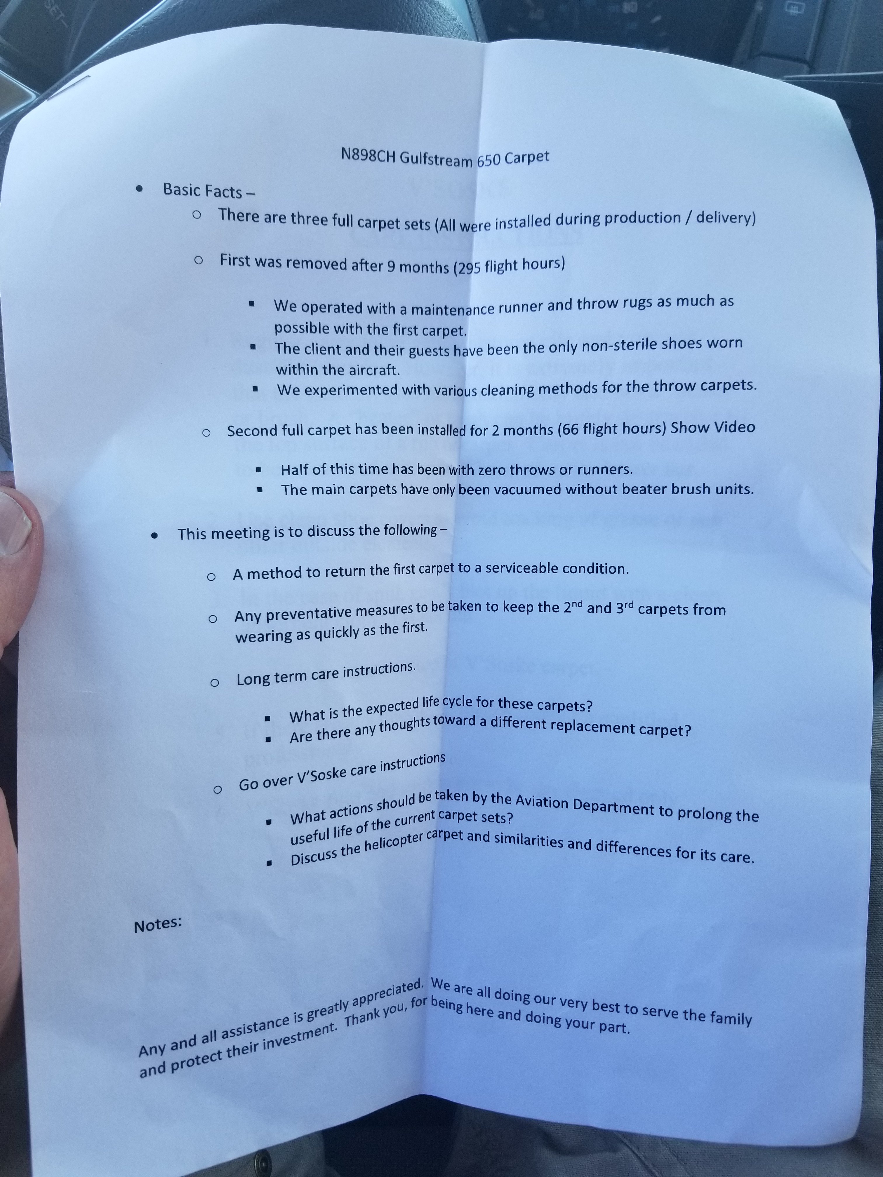 They have the insurance to clean the carpet when its in the plane, I do not (30k a year)..
