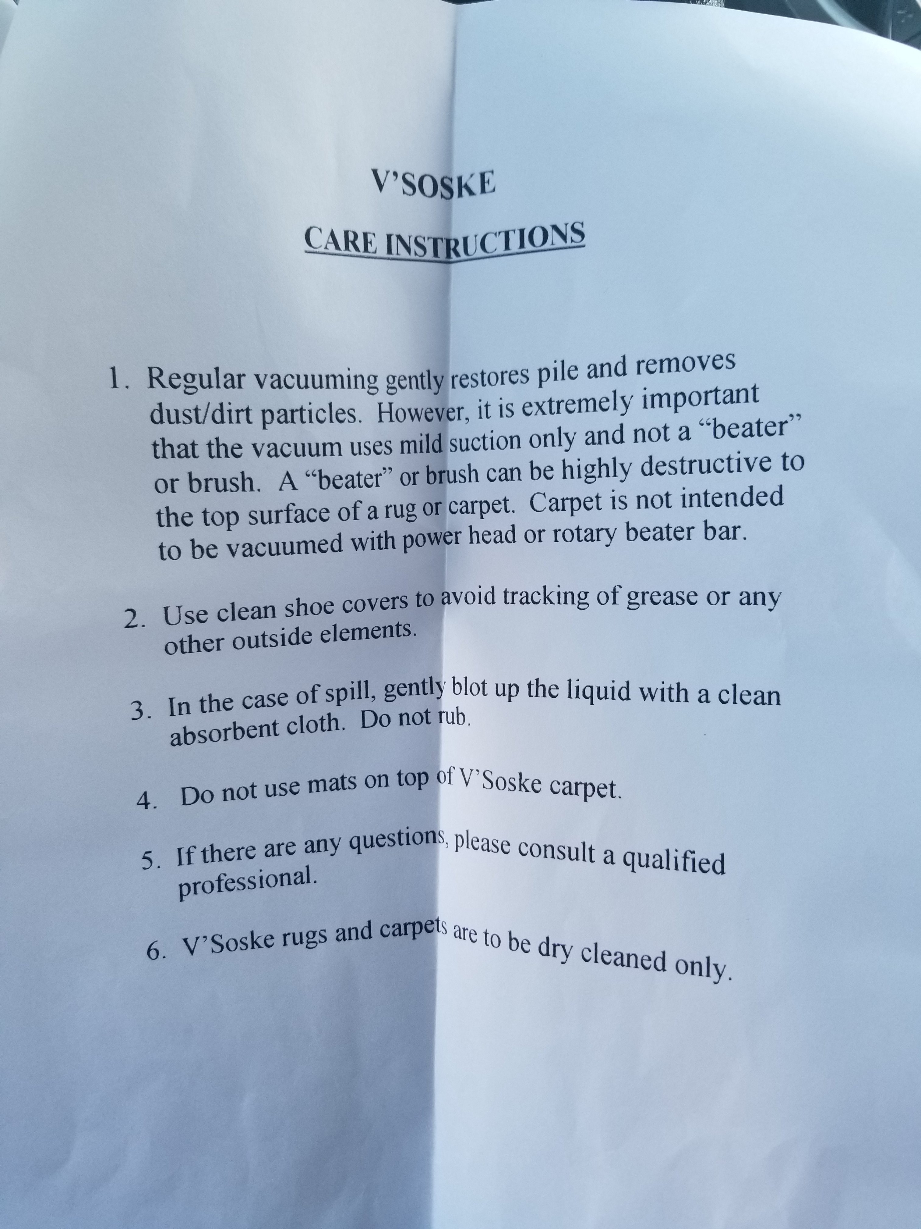 The designers are insisting that no water, no protector, no beater bar vacuums and no runners be used due to the manufacturers instructions...